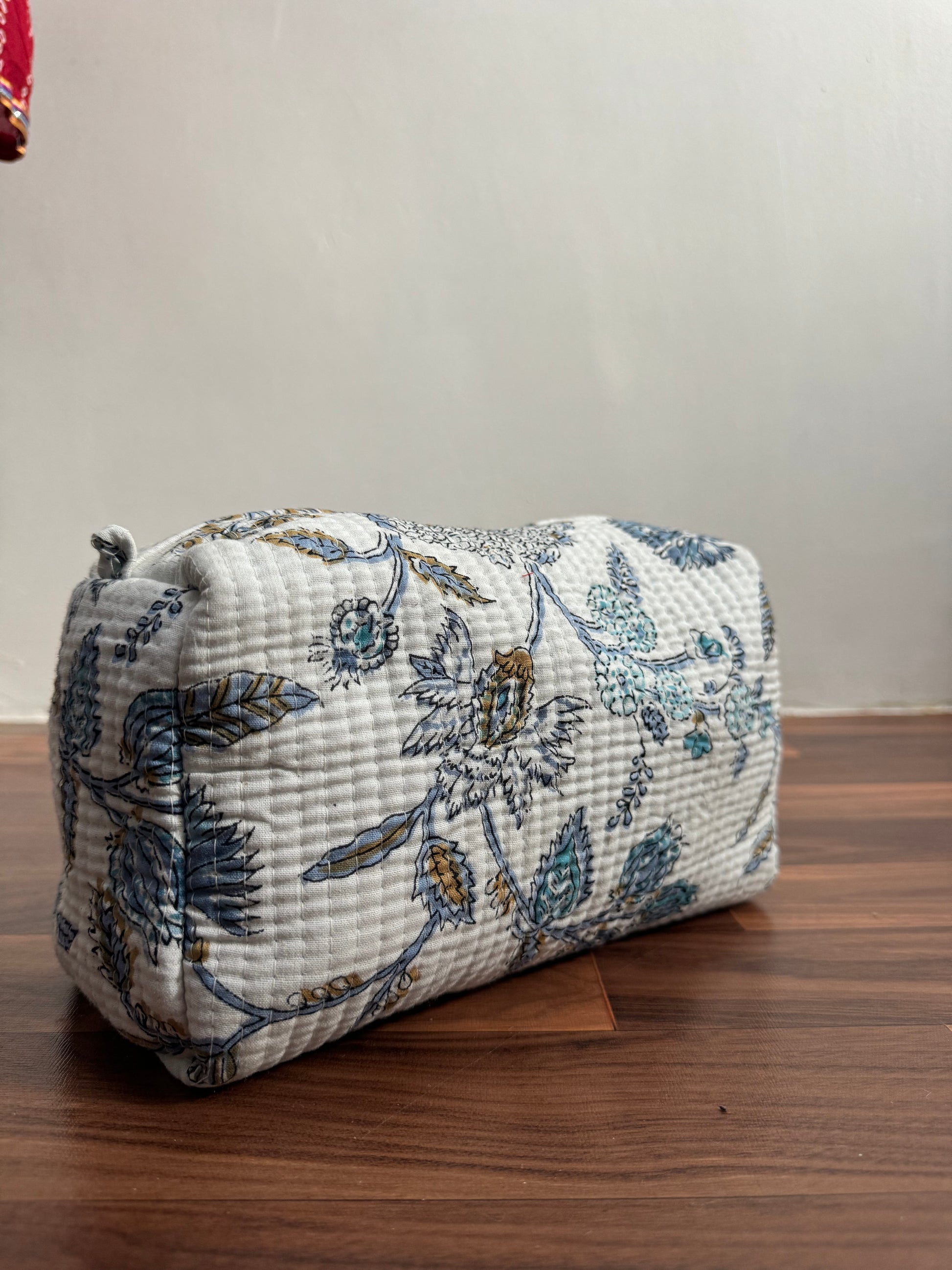 Our cotton quilted fabric toiletry and cosmetic pouches are the perfect travel companions, offering style, practicality, and sustainability. Available in three sizes or as a complete set, they make organizing your toiletries, lingerie, medications, and makeup effortless. Each pouch is lined with high-quality silicone plastic to manage leaks and damp items and includes four additional interior pockets for extra storage.