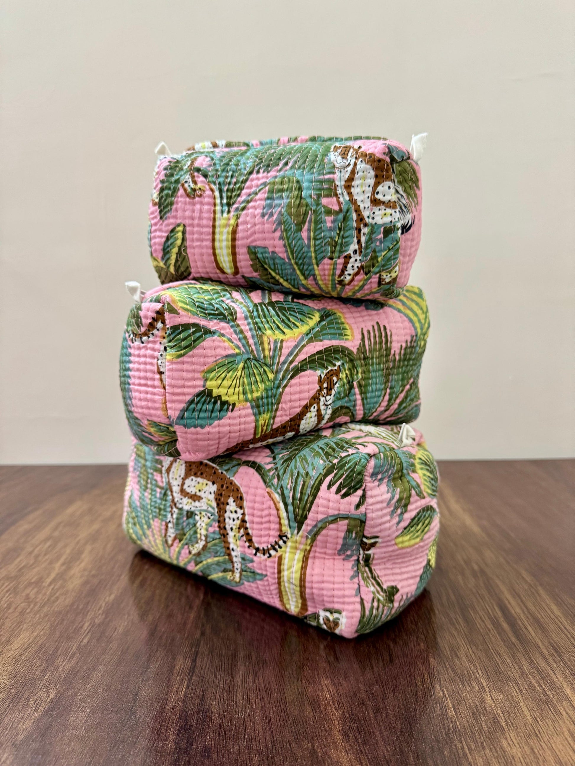 Our cotton quilted fabric toiletry and cosmetic pouches are the perfect travel companions, offering style, practicality, and sustainability.