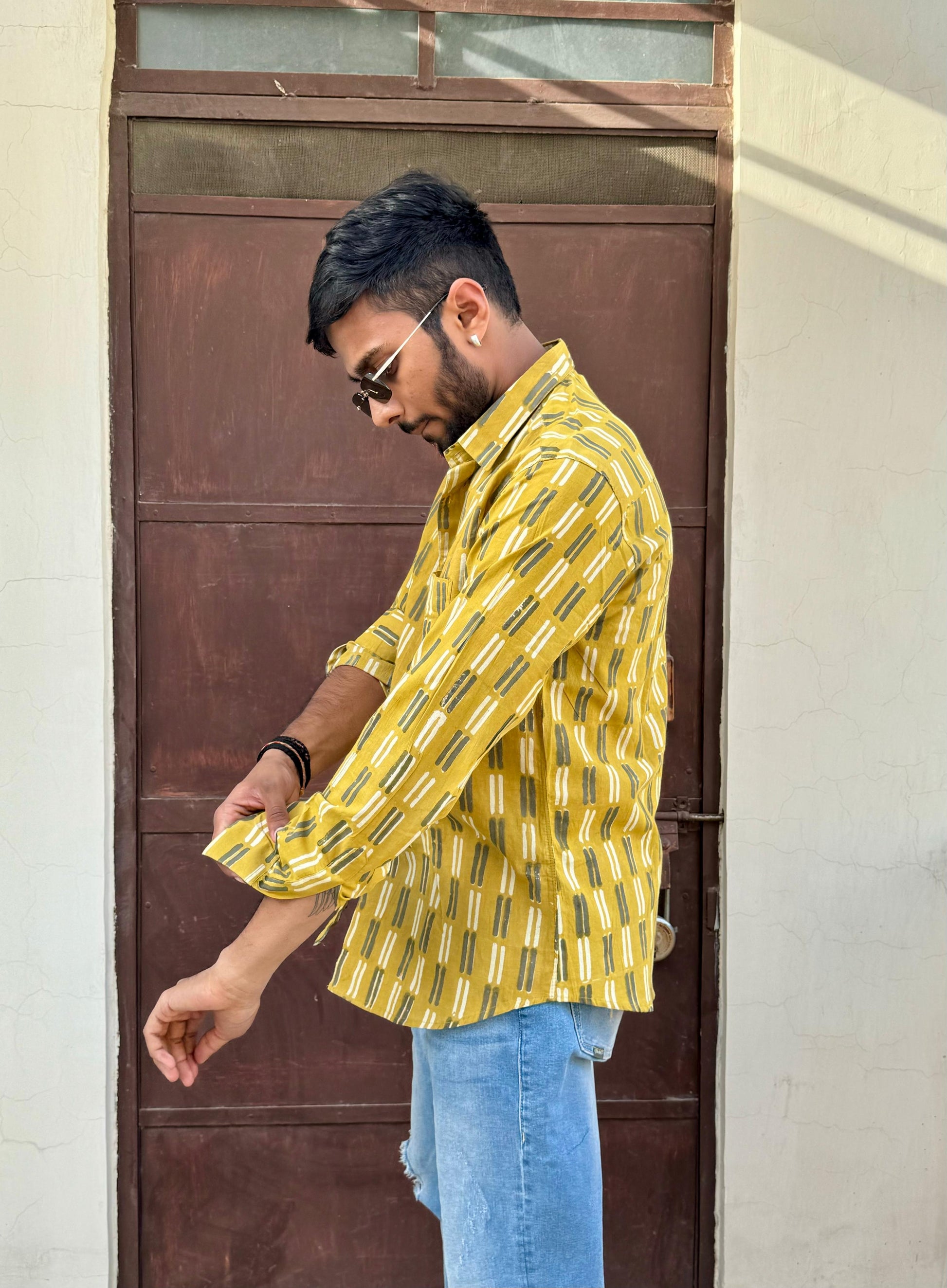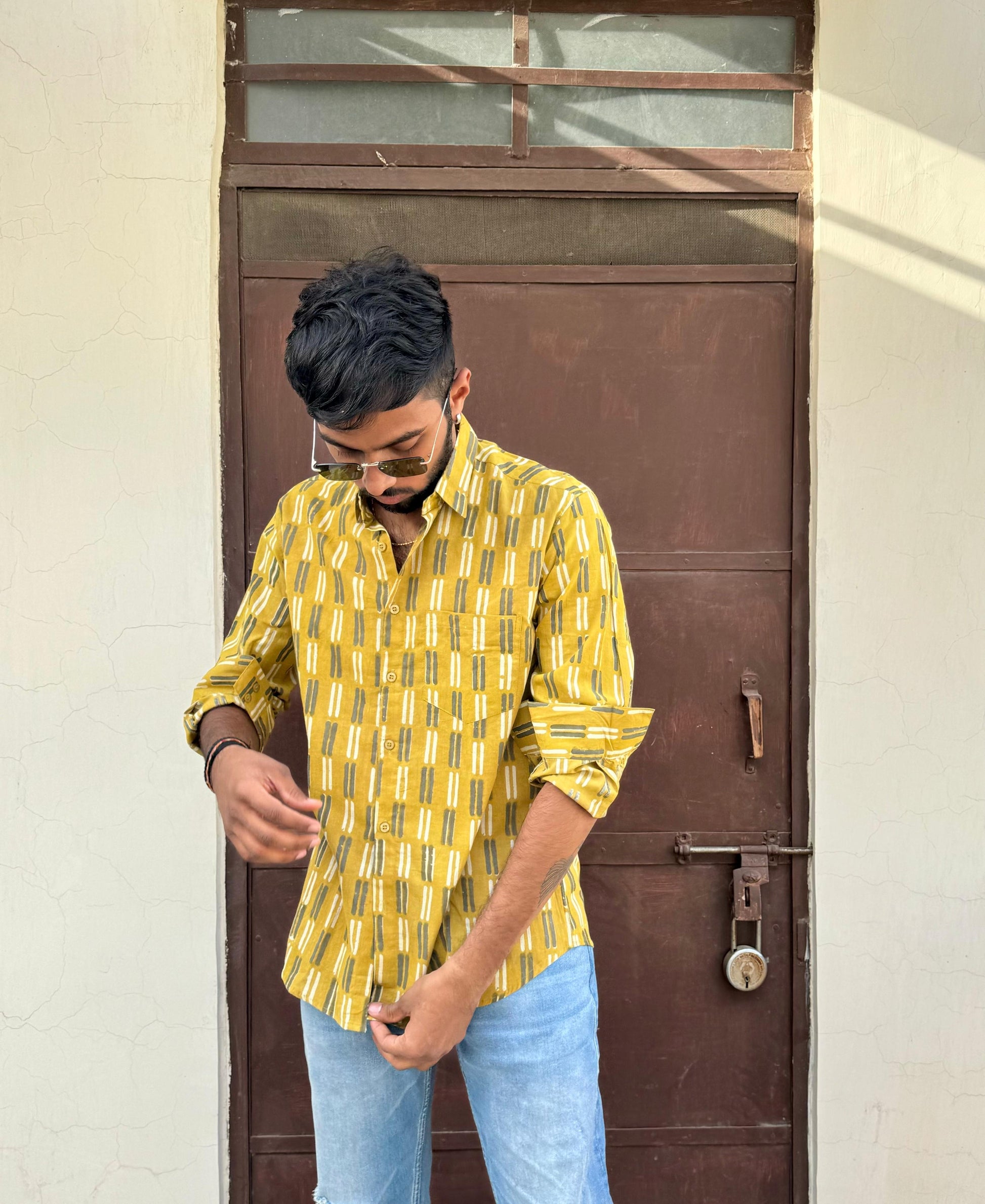 The fabric is made of lightweight indian cambric cotton and has a soft feel. The shirt comes in base mustard yellow with intricate dabu print is hand-printed all-over. It has a front button closure and a slightly rounded hemline.