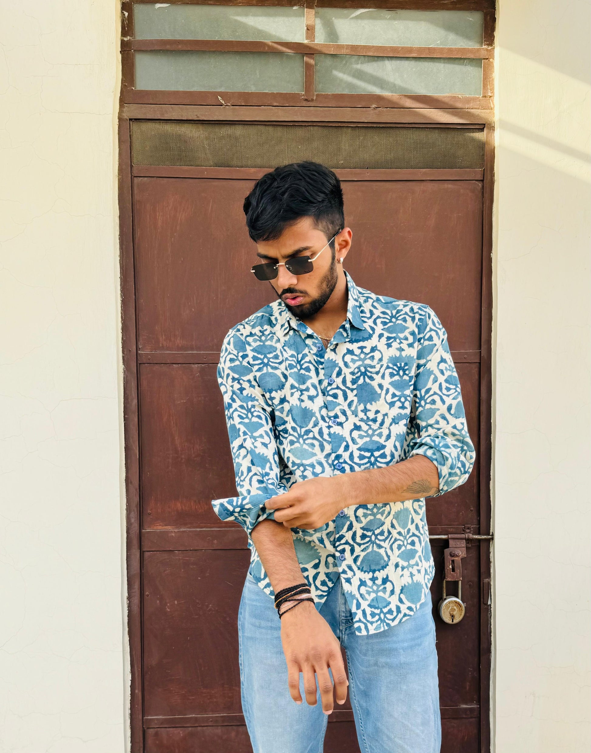 The fabric is made of lightweight indian cambric cotton and has a soft feel. The shirt comes in base white with blue flowers is hand-printed all-over. It has a front button closure and a slightly rounded hemline.