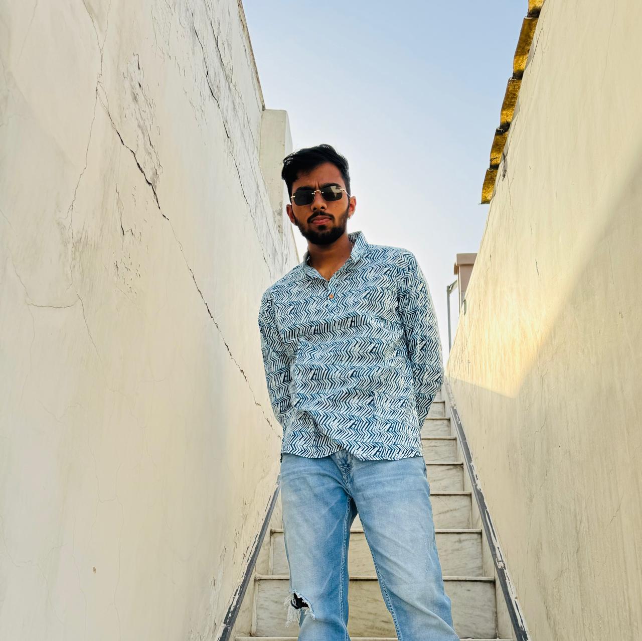 The fabric is made of lightweight cotton and has a soft texture, with a GSM of 75. The shirt comes in perfect shades of Indigo and is hand-printed with a wave pattern all-over. It has a front button closure and a slightly rounded hemline.