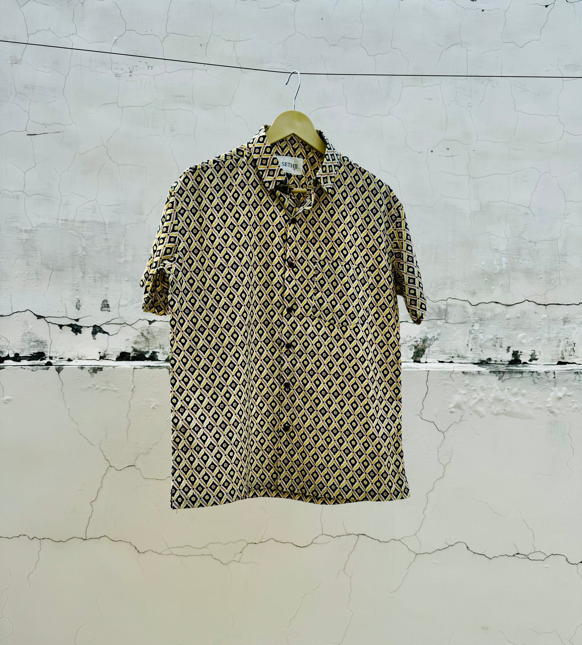 The Udaipur Shirt is a marvel of comfort and style. Made from soft Indian cotton, it is breathable and perfect for everyday wear. Print inspired from the udaipur city palace Jharokhas & sandstone finish wall colours Crafted by skilled artisans from Rajasthan, it features an intricate handblock print. Its relaxed fit ensures all-day comfort, with no worries about shrinkage as we wash our fabrics before printing.